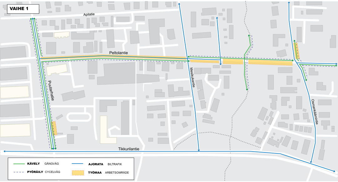 During the work, Peltolantie will have to be closed to motor vehicle traffic in two parts between Mesikukantie and Osmankäämintie, but access to properties will still be possible. Please check the driving routes on the attached maps. Phase 1 will last for approximately two weeks, followed by phase 2, which will continue for another two weeks.