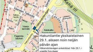 Hakunilantie 10 kohdalla yksi kaista käytössä 29.1. alkaen viisi päivää