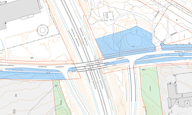 Alla olevassa kuvassa Länsimäentie yllittää Porvoonväylän ja kuvaan on piirretty työalueet sinisellä