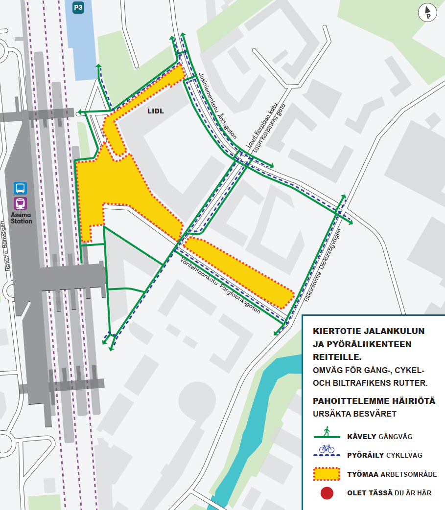 Uudet työmaat sijaitsevat Väritehtaankadun ja Jokiniemenkadun ympäristöissä. Väritehtaankadun varren alueilla aloitetaan ratikan rakentamiseen liittyvät kunnallistekniikan ja pohjarakentamisen työt. Jokiniemenkadun puolella otetaan käyttöön työmaaliikenteen oma reitti.