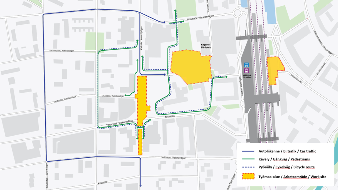 Körförbindelsen till Tikkuparkki förblir oförändrad i september. I oktober öppnas en ny körförbindelse till parkeringsanläggningen via Näckrosvägen och bibliotekets parkeringsområde. De nuvarande fotgängaringångarna till Tikkuparkki kommer att förbli i bruk.